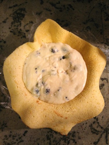 Riprendete quindi la pasta biscotto che ormai sarà fredda e togliete da un lato la pellicola. Stendetela nello stampo dal lato in cui invece l’avete lasciata facendola aderire bene al fondo.