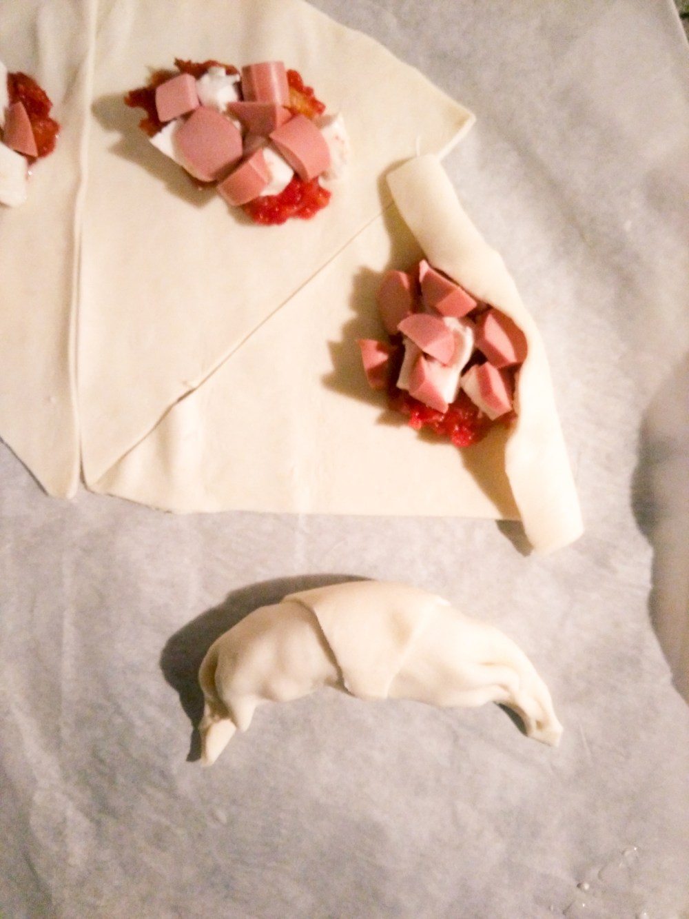 Sono dei cornetti di sfoglia alla pizzaiola quindi ripieni di pomodoro e mozzarella..io ho aggiunto dei pezzetti di wurstel ma ovviamente potete mettere quello che più preferite! Un’oliva, un pomodorino secco, un formaggio più saporito..