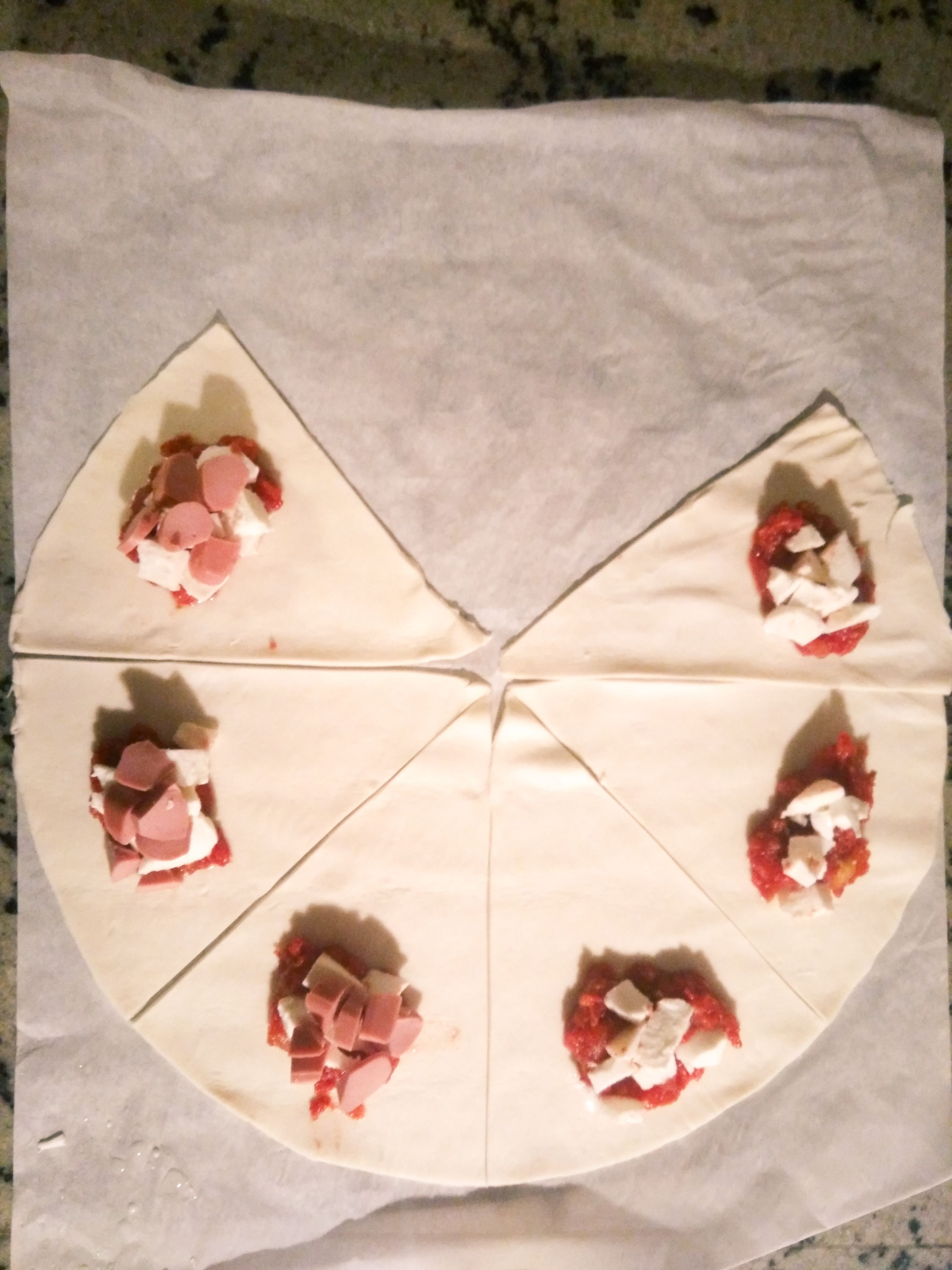 Prendete la pasta sfoglia e tagliatela in 8 spicchi.