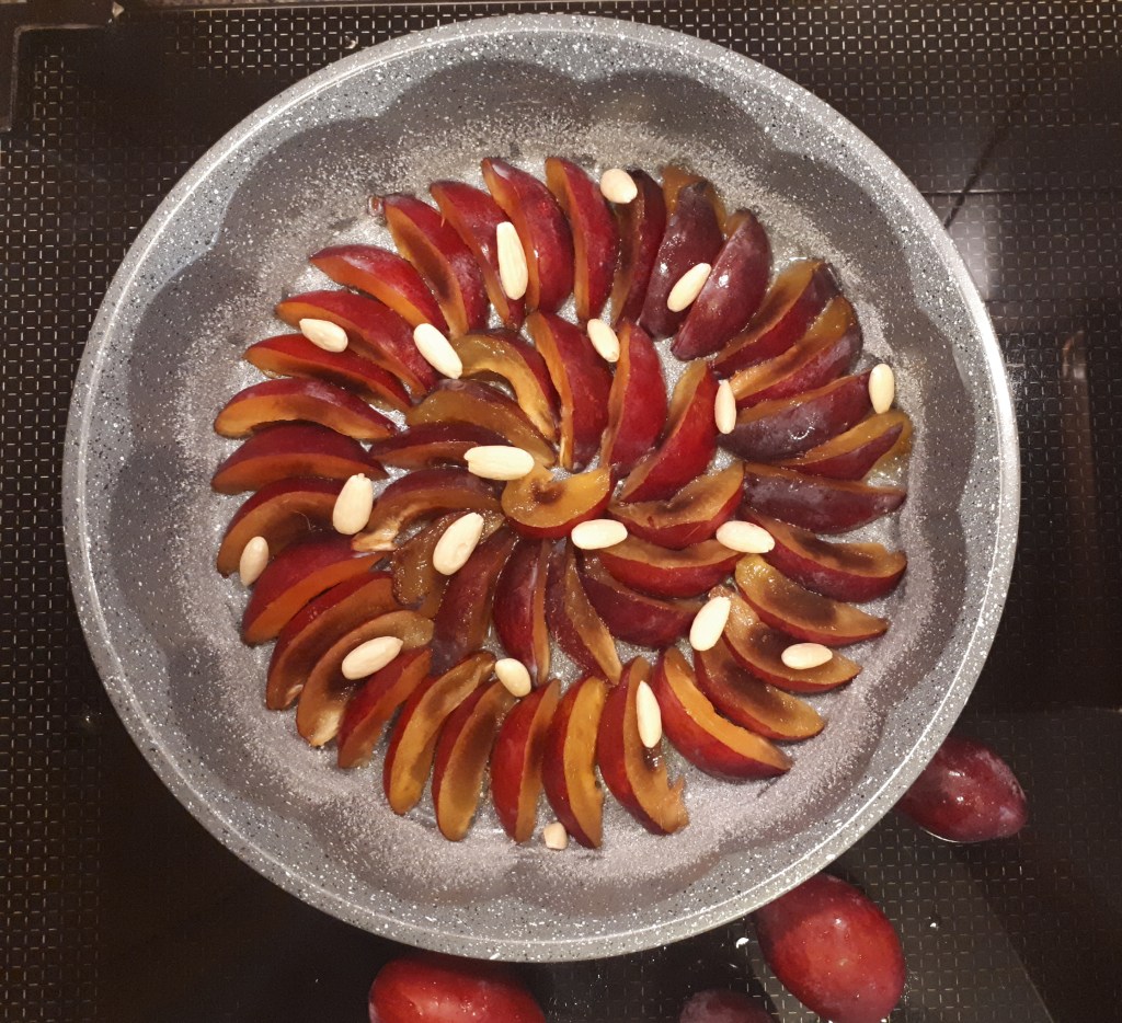 Distribuite sul fondo della teglia le prugne tagliate a fettine creando un motivo di cerchi concentrici come in foto, poi cospargete le prugne con le mandorle (che potete anche tostare se volete e tagliarle a lamelle):